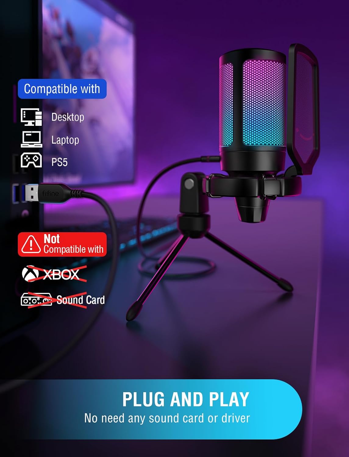 - Gradient RGB & Quick Mute - With bicolored lighting, RGB alters seven color modes by itself in a gradient way. It adds a carnival atmosphere with light-up computer setups, putting you in the fierce game arena. The quick mute button at the top is handy to touch. Even when you concentrate on the game, you can immediately mute your mic. RGB LED is off when the mic is muted to tell you the working status. Prevent your streaming from accidents caused by forgetting to mute the mic.